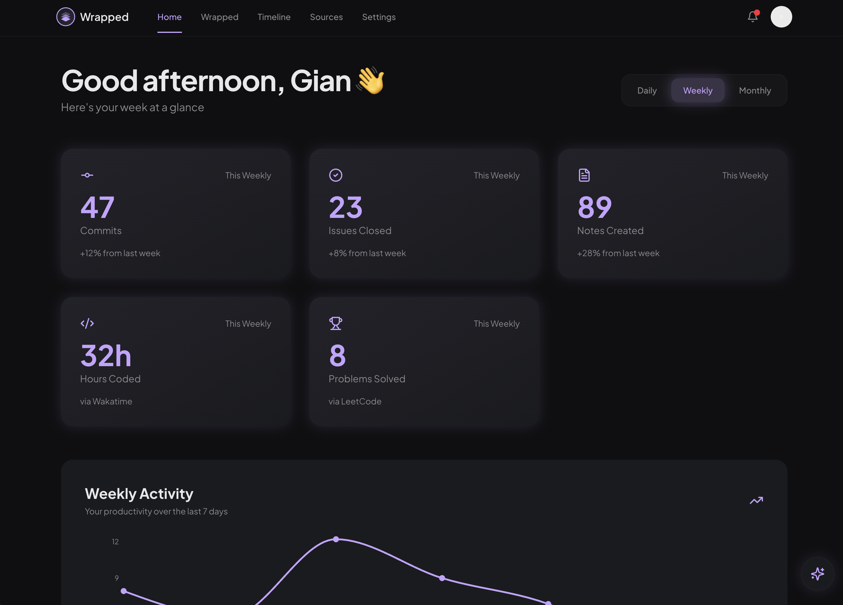 Side project: Data aggregator that summarizes work activity from GitHub, LeetCode, Calendar, Wakatime, and more